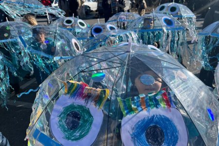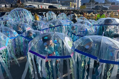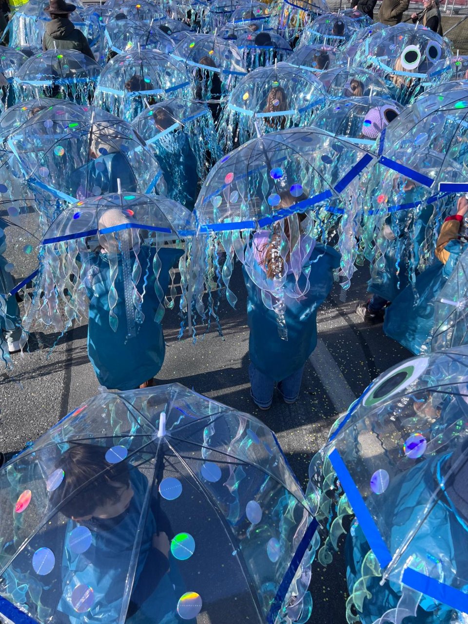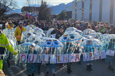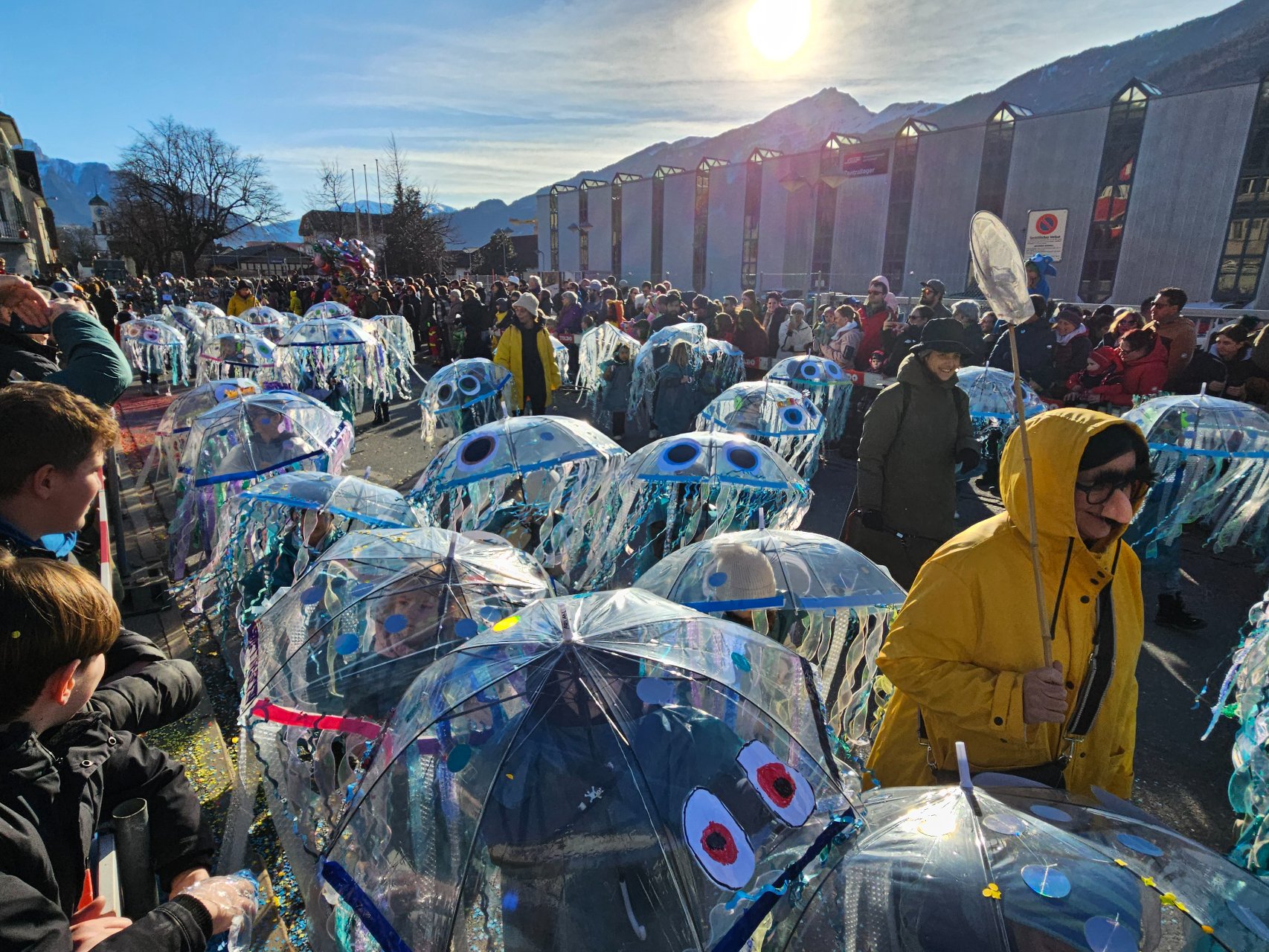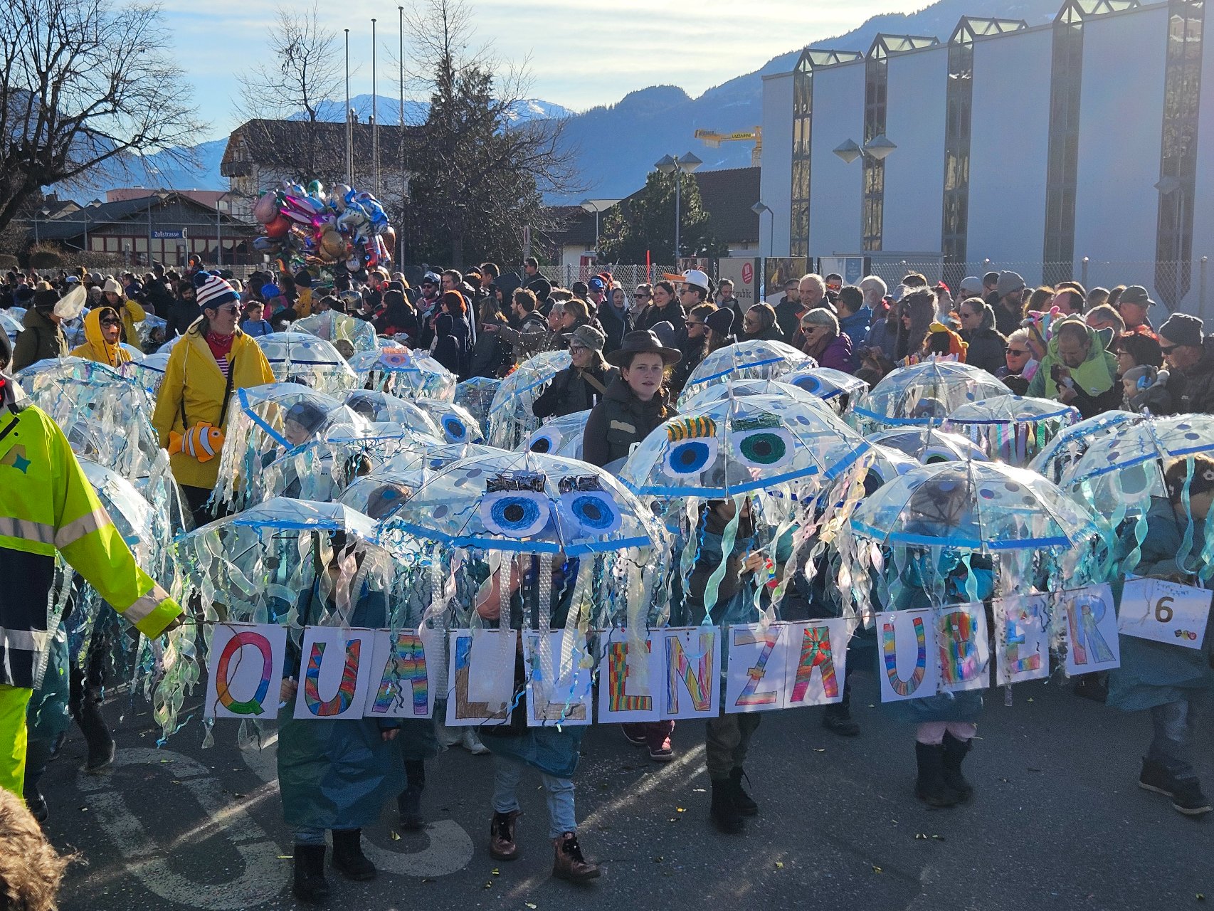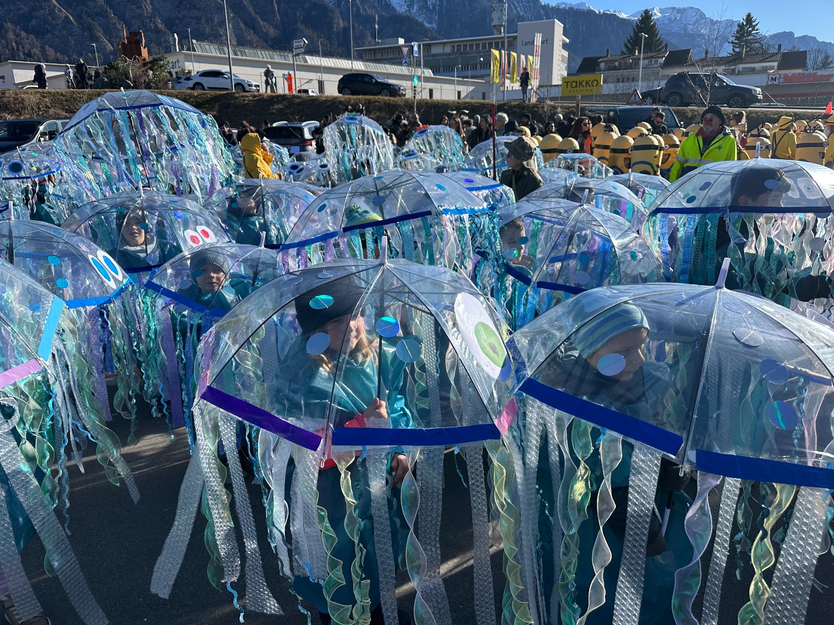 Der Kindergarten Igis nahm zum Motto Quallenzauber teil und verzauberte die ZuschauerInnen mit ihren schillernden Quallenkostümen. Bis zum Startschuss war aber für alle viel Geduld gefragt, doch mit Tanzen zur Musik liess sich die Wartezeit leichter überbrücken. Dann ging es endlich los. Die Kinder waren gespannt, und die zahlreichen Zuschauer verfolgten den Umzug begeistert. Die Guggamusiken gaben den Takt an. Als besonderes Intermezzo hatten wir eine Fasnachtspfeife dabei, nach deren Signalen sich die Kinder kurz nach unseren Vorgaben bewegten. Die Strecke war für die Quallenkinder sehr lang, und dennoch haben sie sich hervorragend gehalten. Immer wieder liessen sie sich motivieren und liefen weiter. Müde, aber auch stolz, erreichten alle das Ziel.