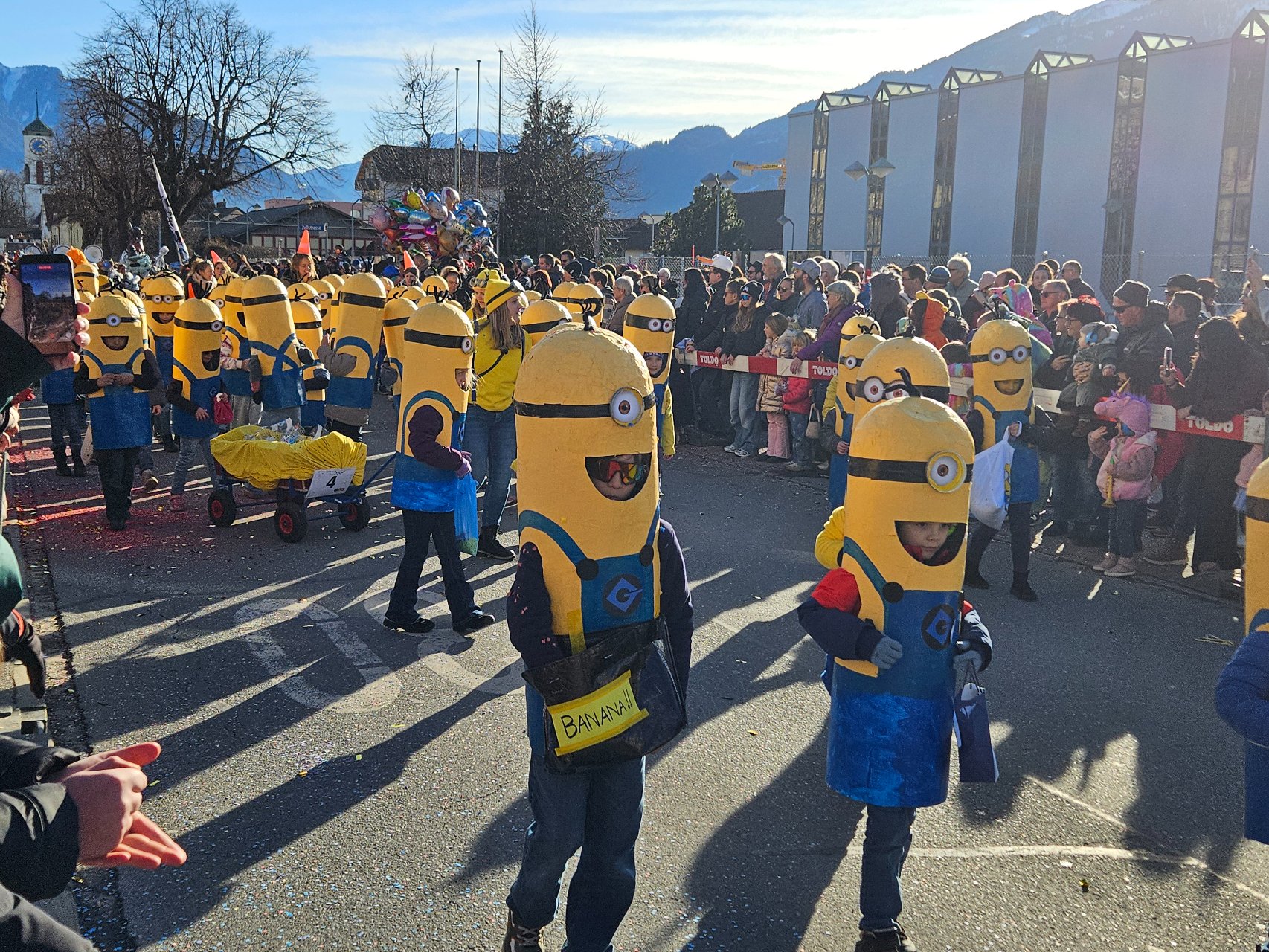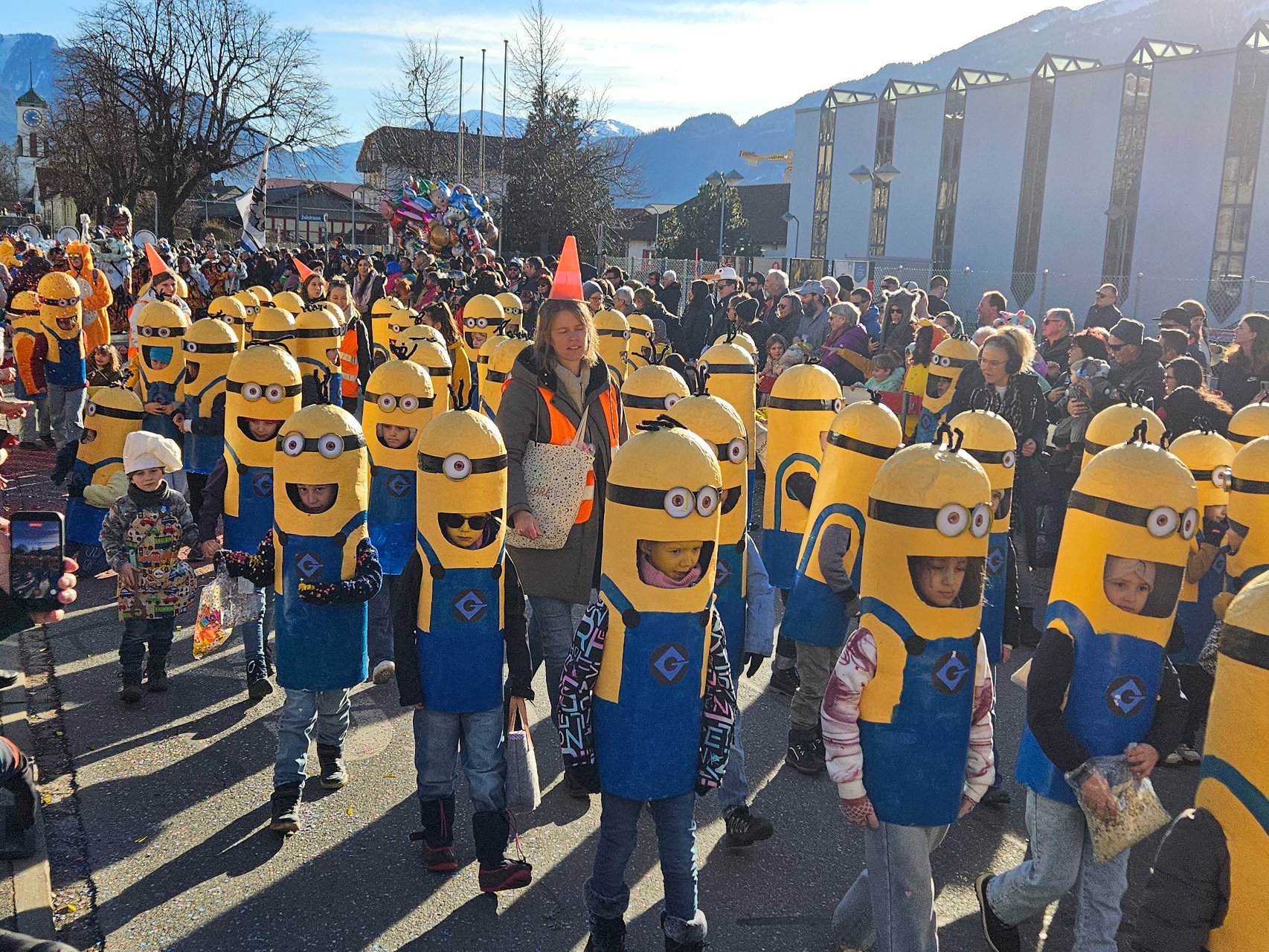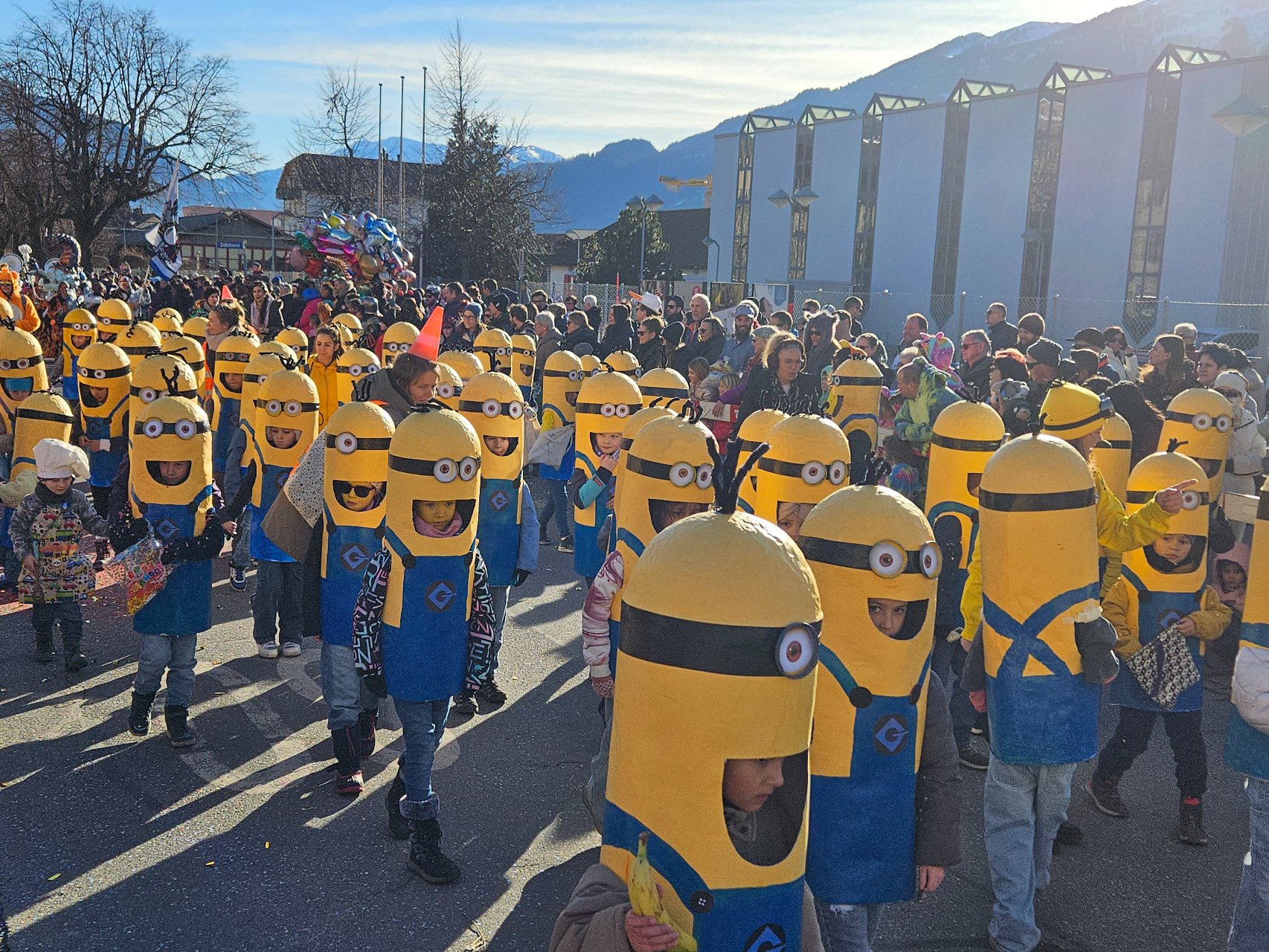 Die 1. und 2. Klassen aus Igis wurden durch eine Klasse aus Landquart unterstützt. Gemeinsam zogen sie als lustige Minions durch die Strassen. Mit ihren gelben Kostümen waren sie nicht zu übersehen und verbreiteten sofort Fasnachtsstimmung. Lachend warfen die Kinder Konfetti in die Menge, verteilten Zückerli und winkten den ZuschauerInnen zu. Strahlender Sonnenschein und ein tiefblauer Himmel machten den Umzug zu einem rundum gelungenen Erlebnis. Besonders schön war die herzliche Stimmung entlang der Route.
