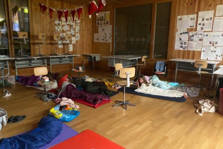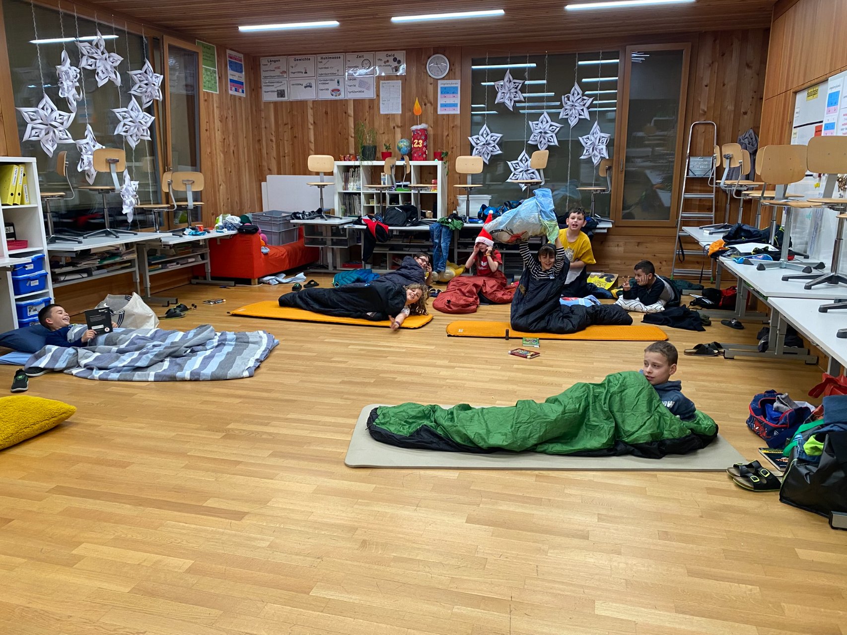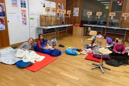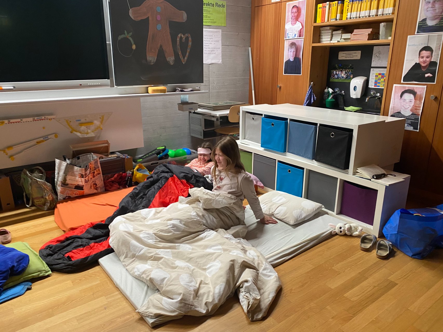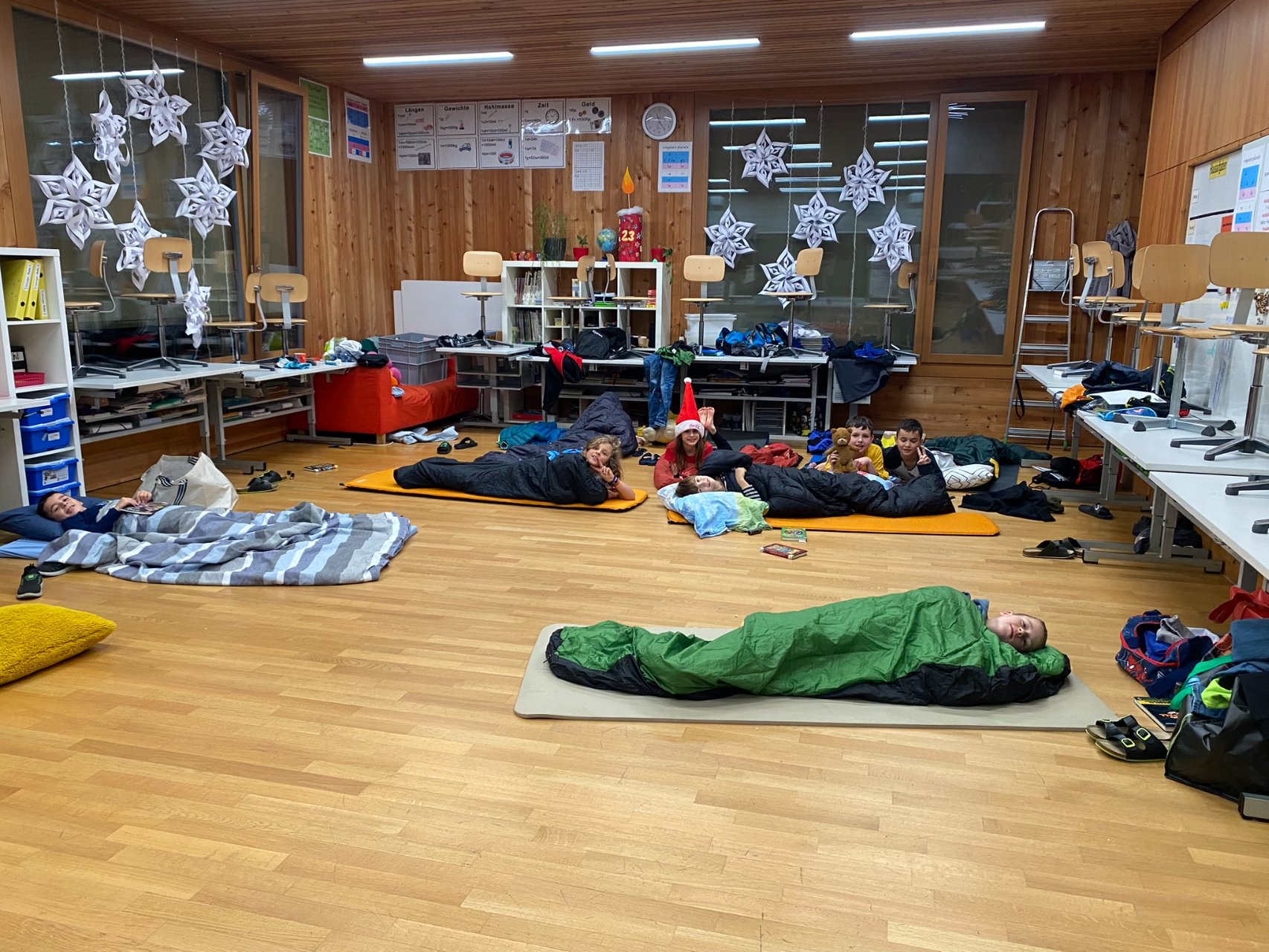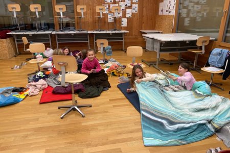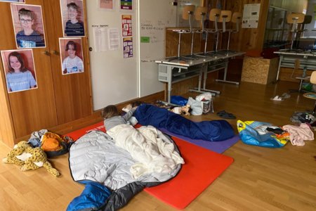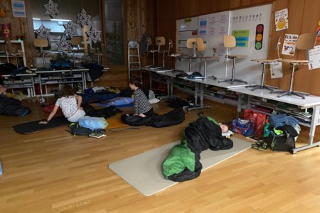 Und dann, um Mitternacht konnten fast 60 müde Kinder (und Lehrpersonen) in die Schlafsäcke kriechen und ins Reich der Träume abdriften. Im Schulzimmer übernachten – so cool!