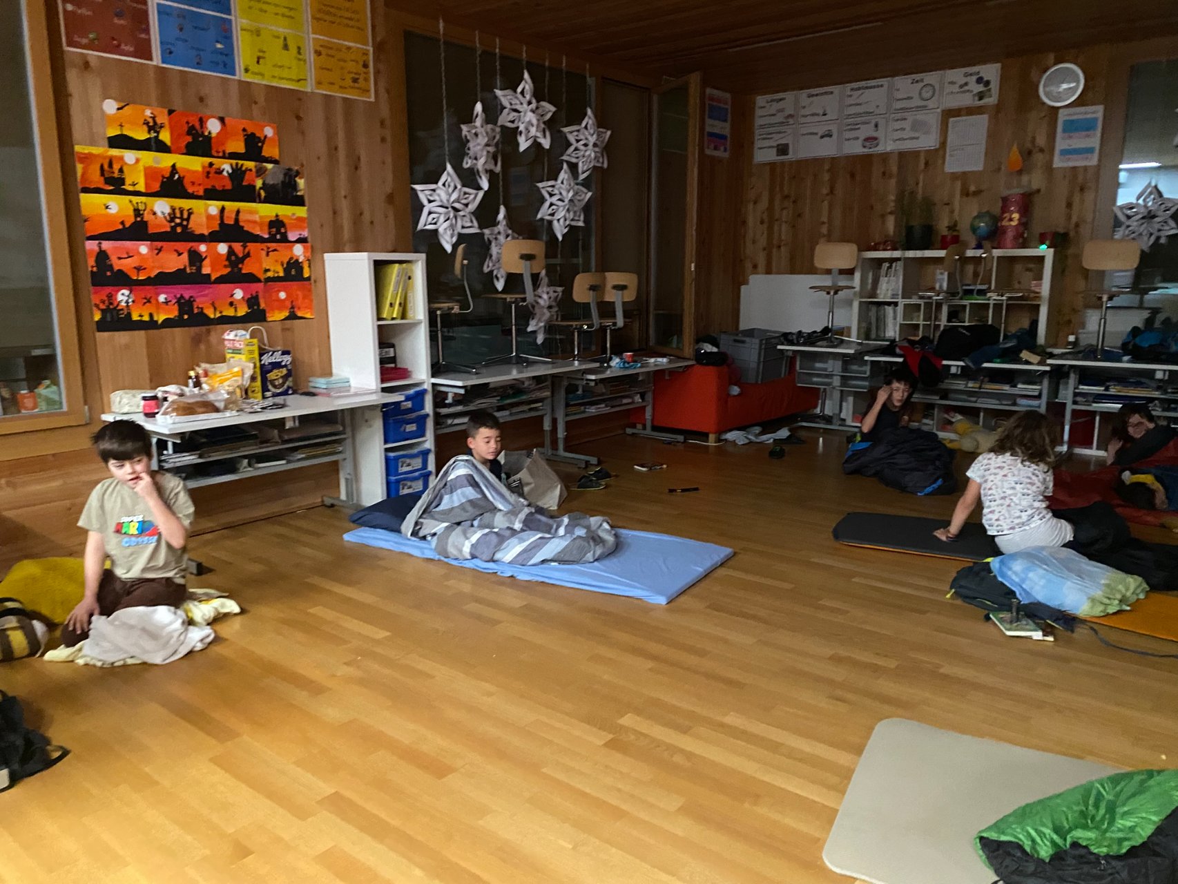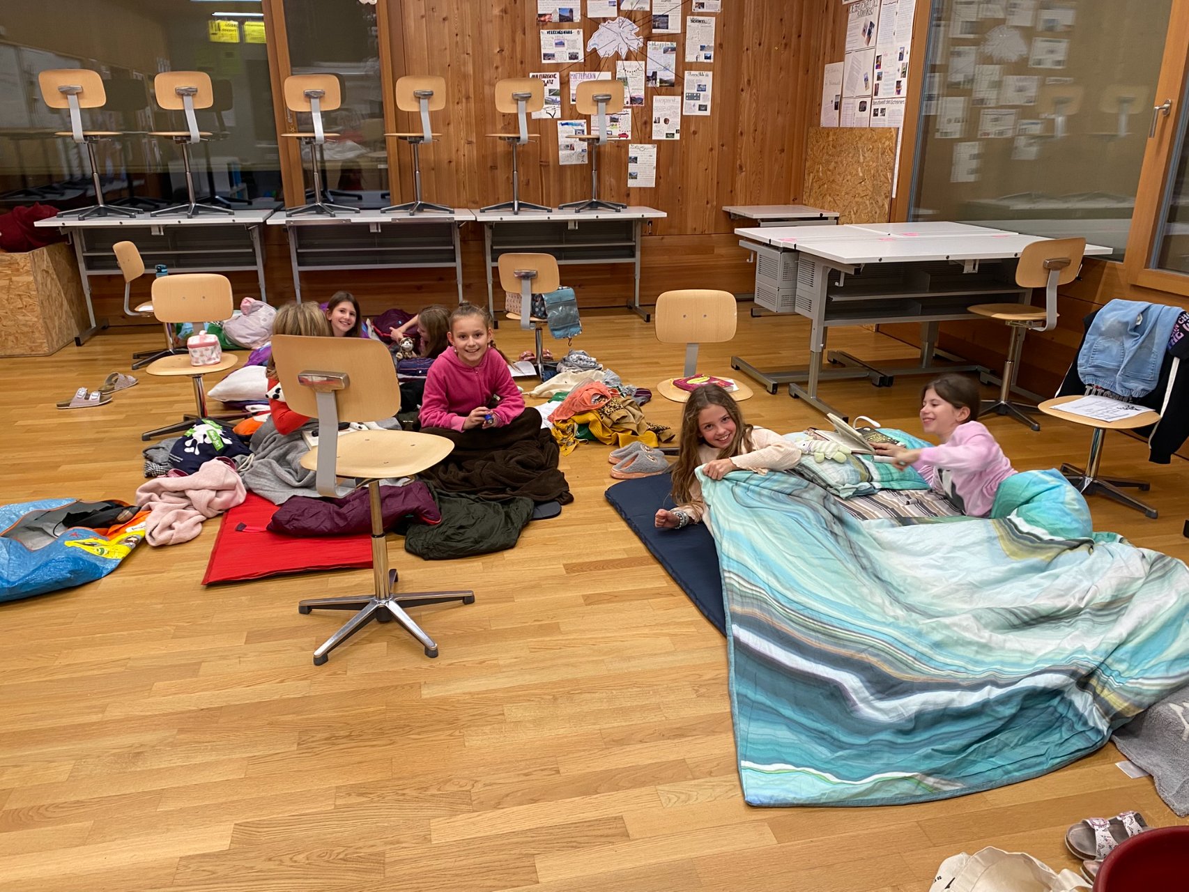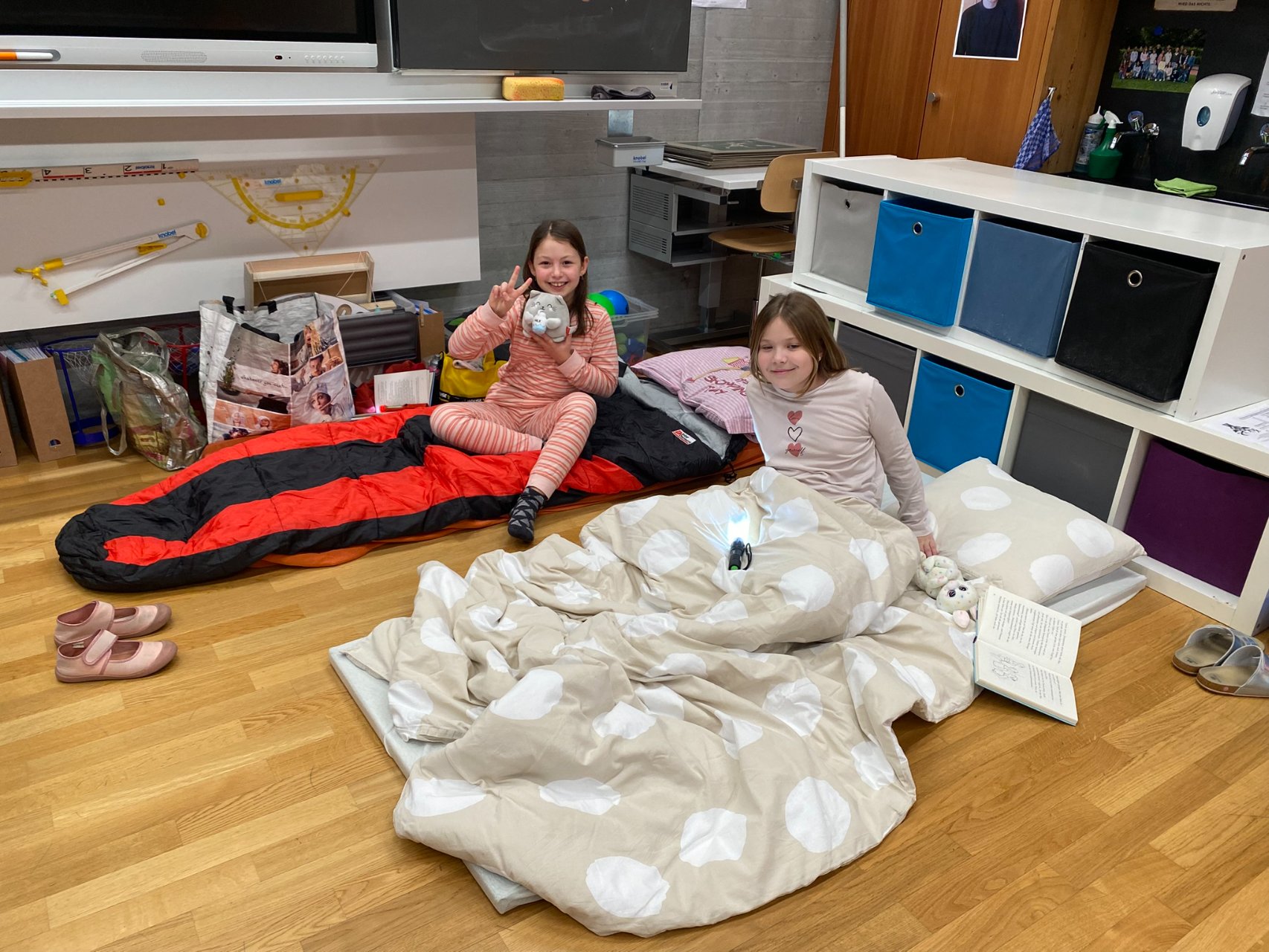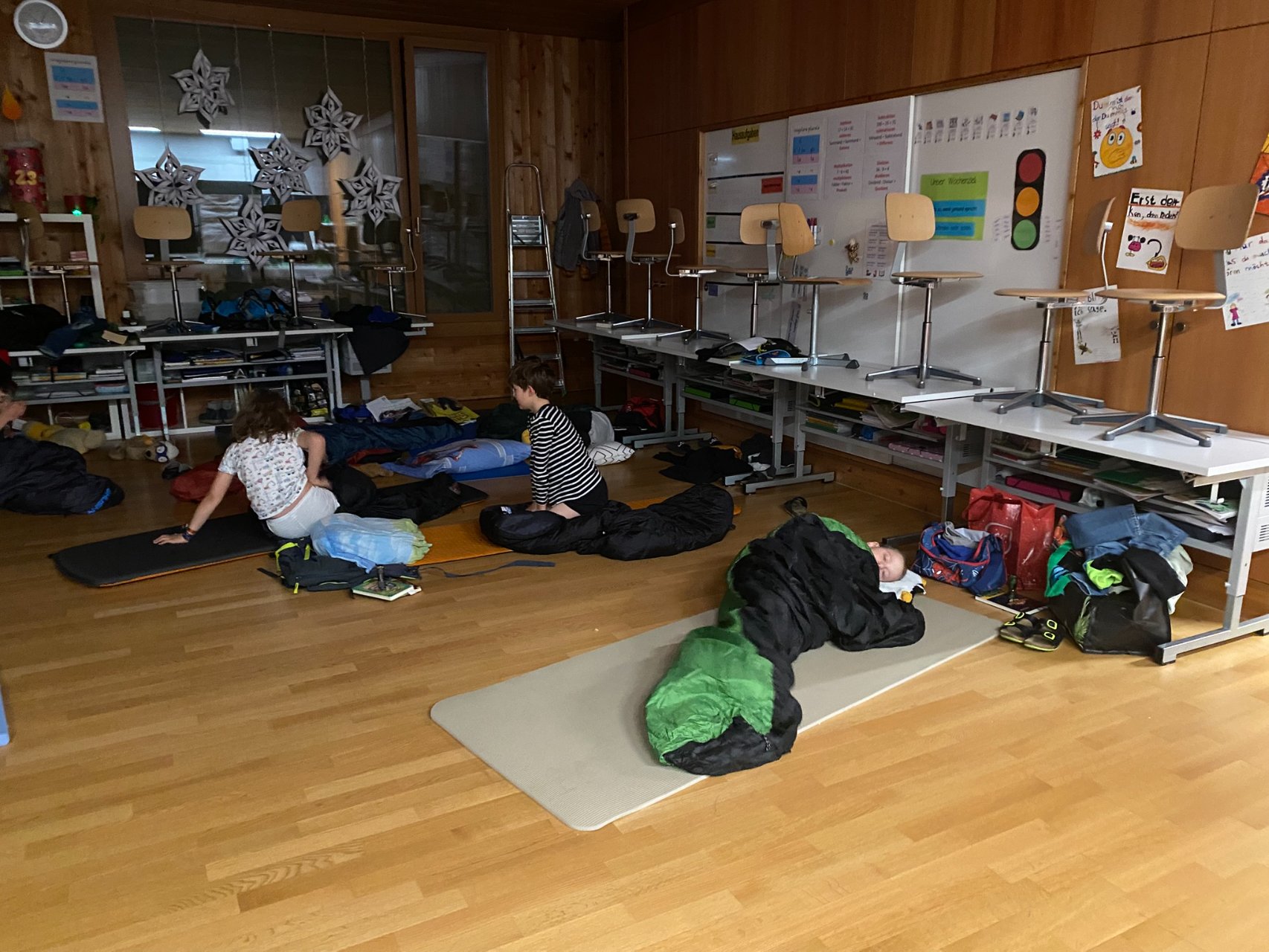 Und dann, um Mitternacht konnten fast 60 müde Kinder (und Lehrpersonen) in die Schlafsäcke kriechen und ins Reich der Träume abdriften. Im Schulzimmer übernachten – so cool!
