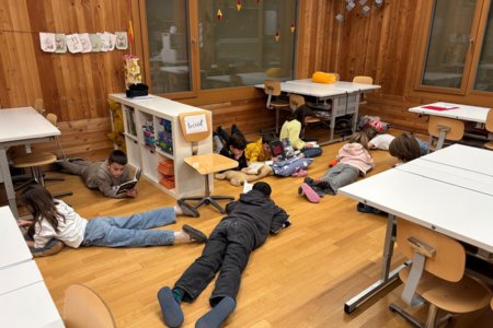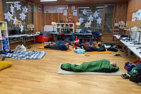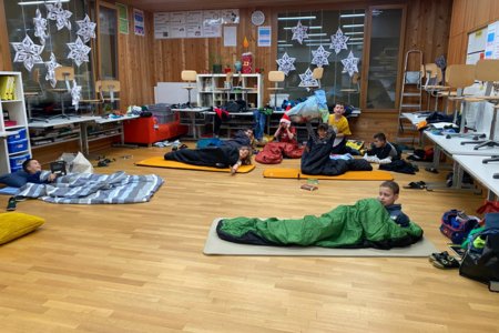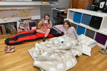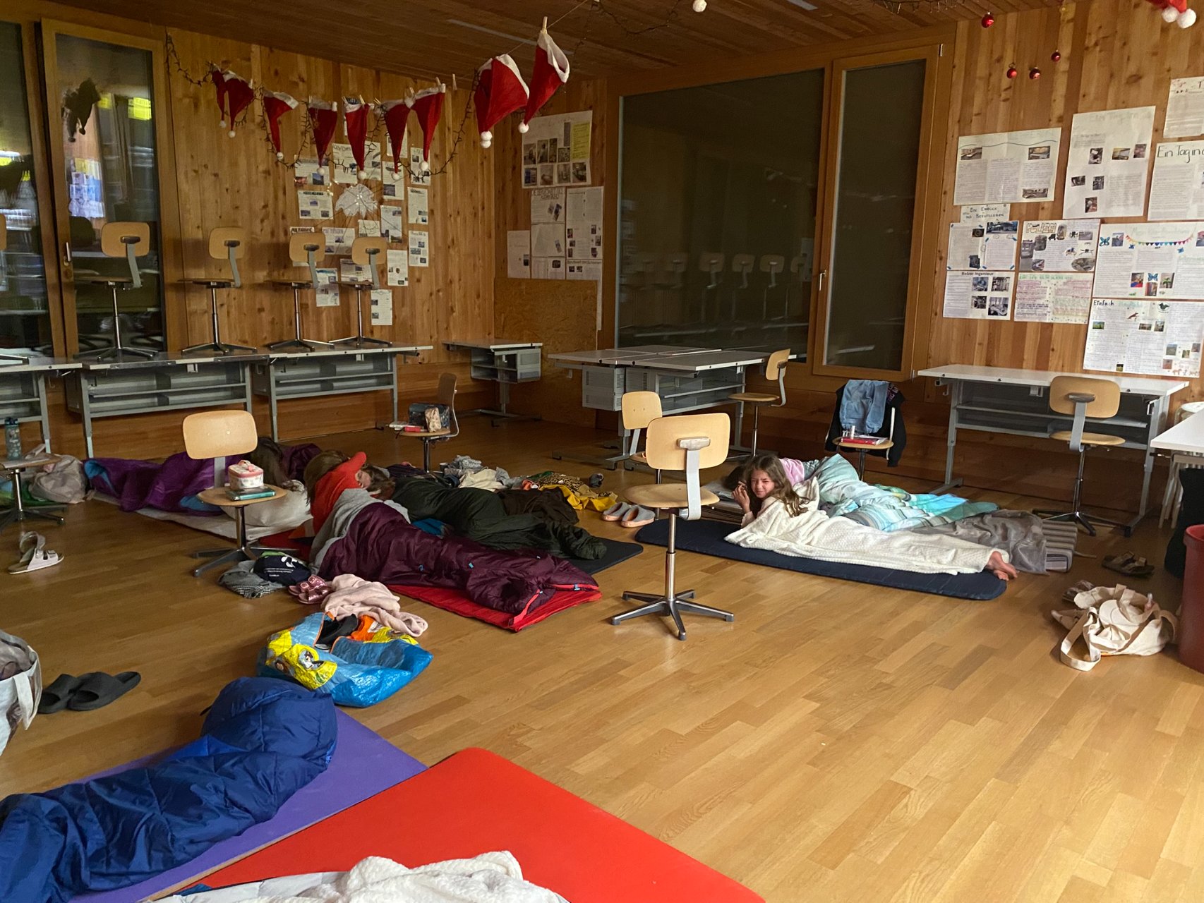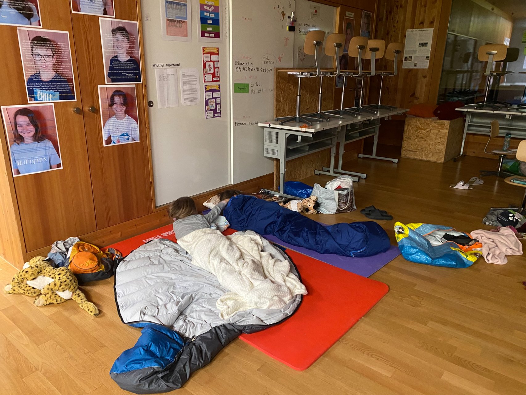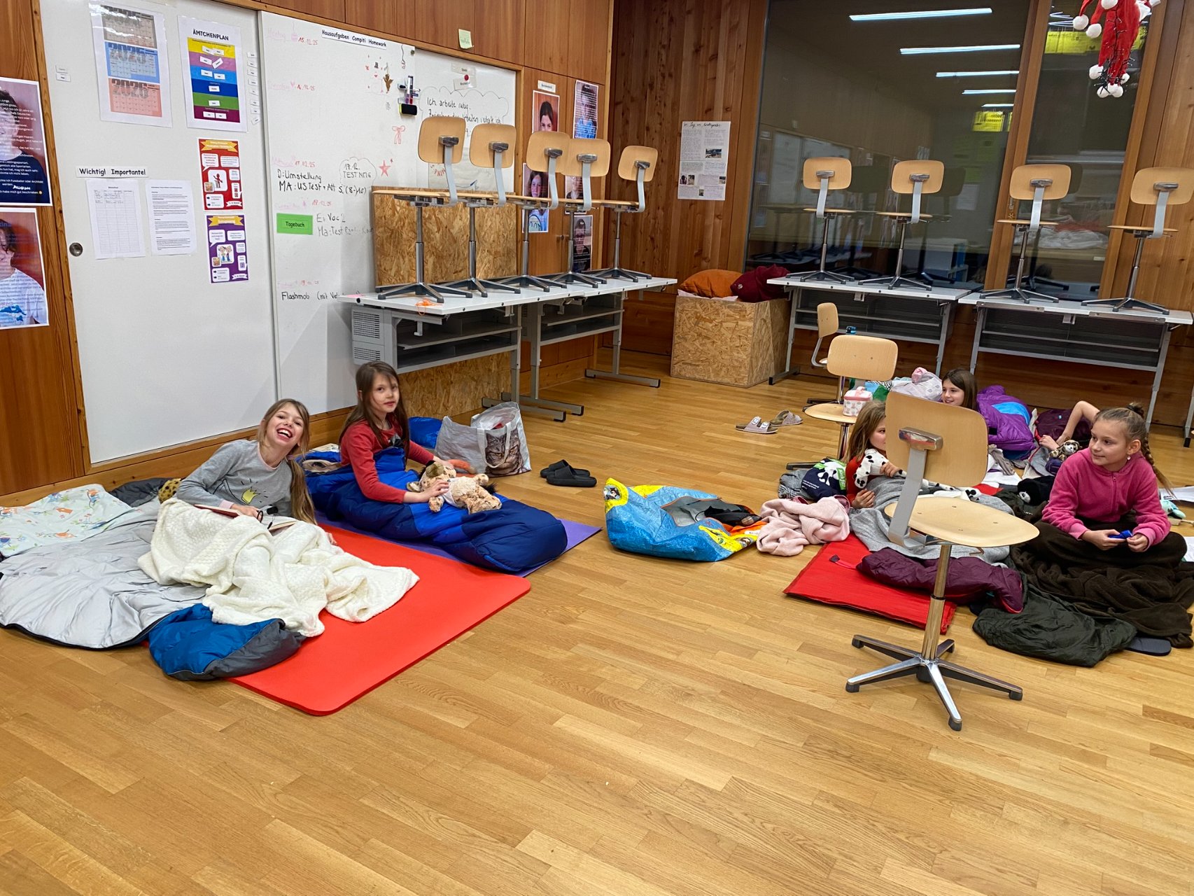 Und dann, um Mitternacht konnten fast 60 müde Kinder (und Lehrpersonen) in die Schlafsäcke kriechen und ins Reich der Träume abdriften. Im Schulzimmer übernachten – so cool!